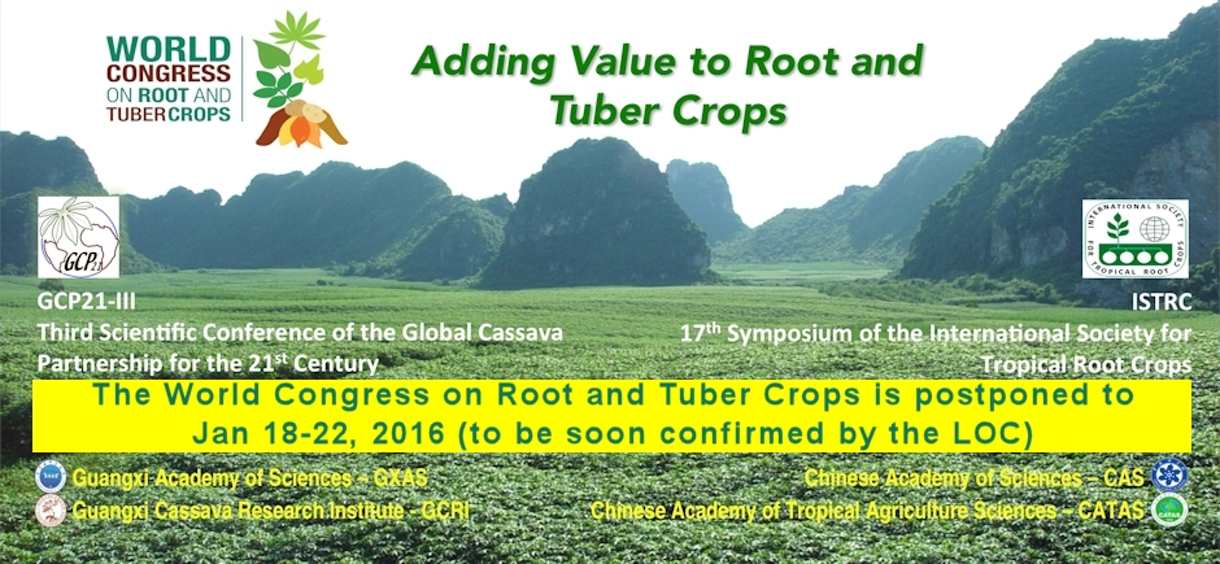 The Global Cassava Partnership for the 21st Century (GCP21) and the International Society for Tropical Root Crops (ISTRC) join forces with CATAS (Chinese Academy of Tropical Agriculture Sciences), and GCRI (Guangxi Cassava Research Institute), to organize the First World Congress on Root and Tuber Crops in Nanning, Guangxi, China, on January 18-22, 2016.